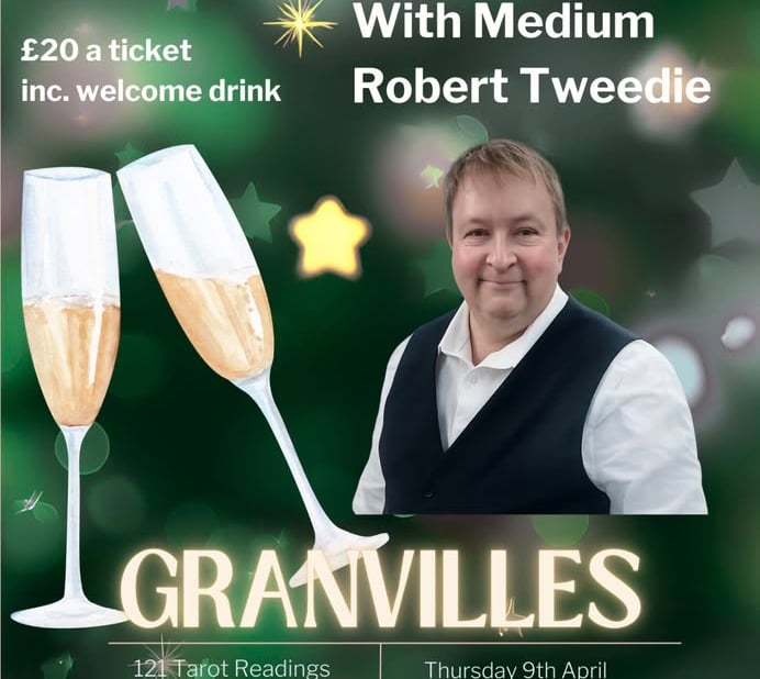 Join us on April 9th at Granvilles in Stone for an evening with medium Robert Tweedie, including a welcome drink and spiritual insights.